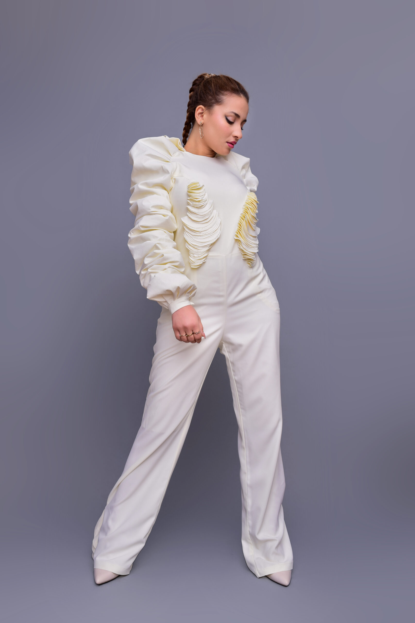 Step into modern elegance with this avant-garde jumpsuit featuring voluminous pleated sleeves and a sleek silhouette. The satin-finish fabric reflects light softly, while the detailed sleeves add depth and movement to your ensemble.