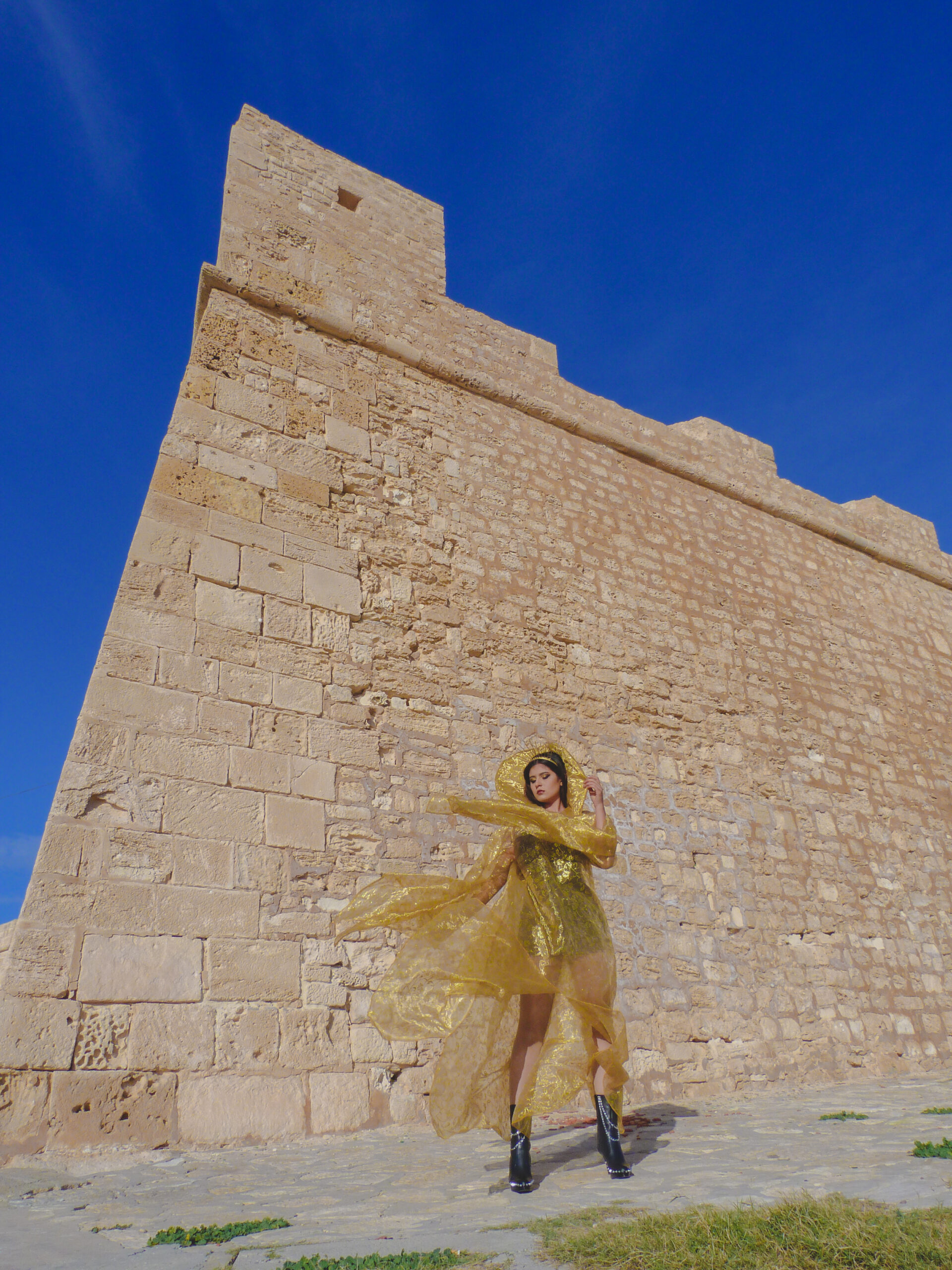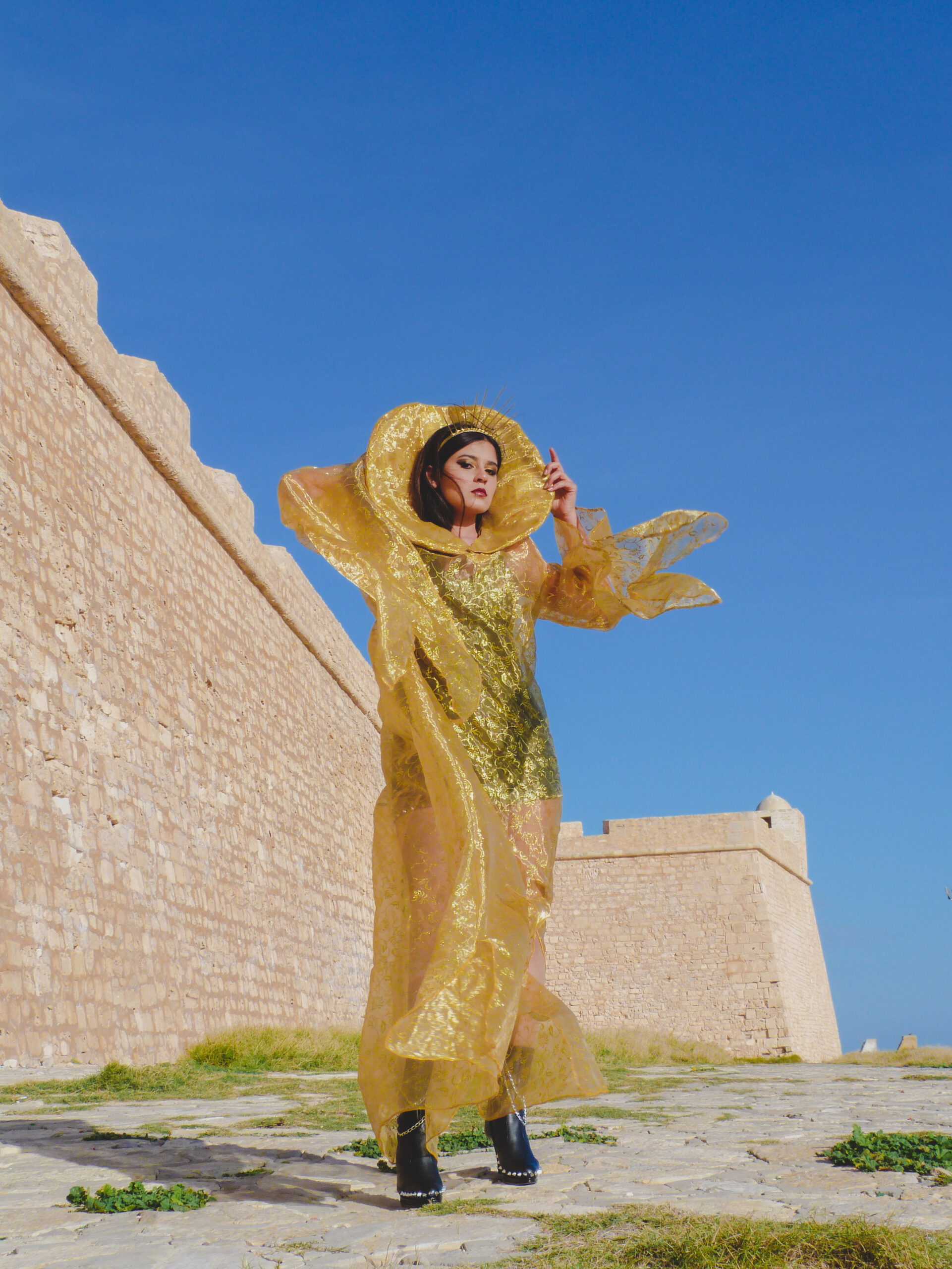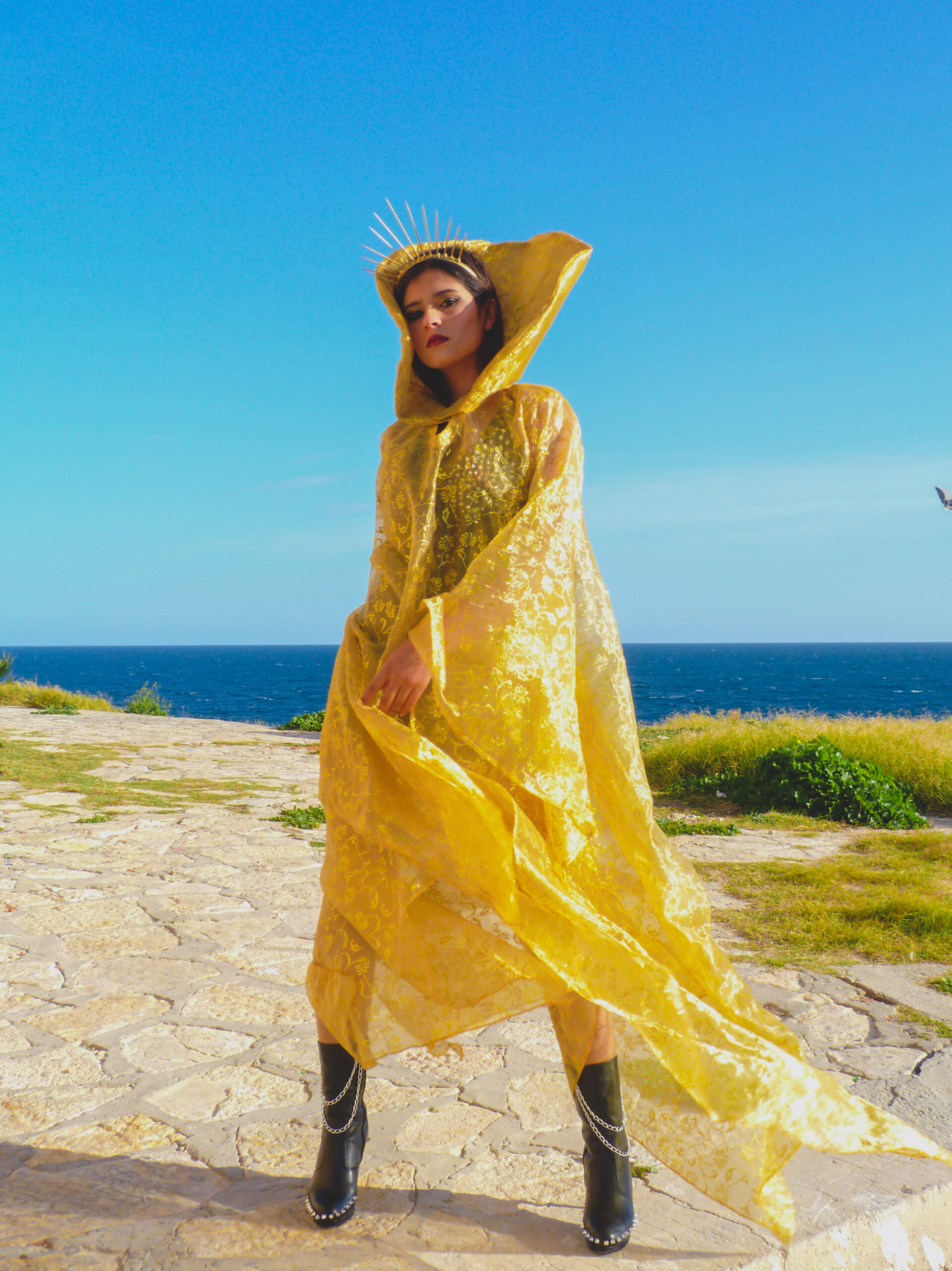 Drape yourself in regal elegance with this breathtaking golden cape gown, meticulously hand-embroidered with golden thread on transparent Organza fabric. Designed to make a grand entrance, this statement piece features two dramatic side slits, voluminous long sleeves, and an exaggerated queen-style collar that rises majestically around the neck. A true couture showpiece, this gown blends opulence, artistry, and powerful presence — fit for a modern-day empress.
